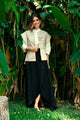 Confeccionada en tono blanco, esta chaqueta destaca por su diseño estructurado y el contraste elegante del cuello en tonos combinados. Los cierres dorados añaden un toque de luz y sofisticación, convirtiéndola en una prenda ideal para transformar cualquier look en una declaración de estilo.