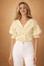 Blusa femenina en tono amarillo suave con delicados detalles de volantes.