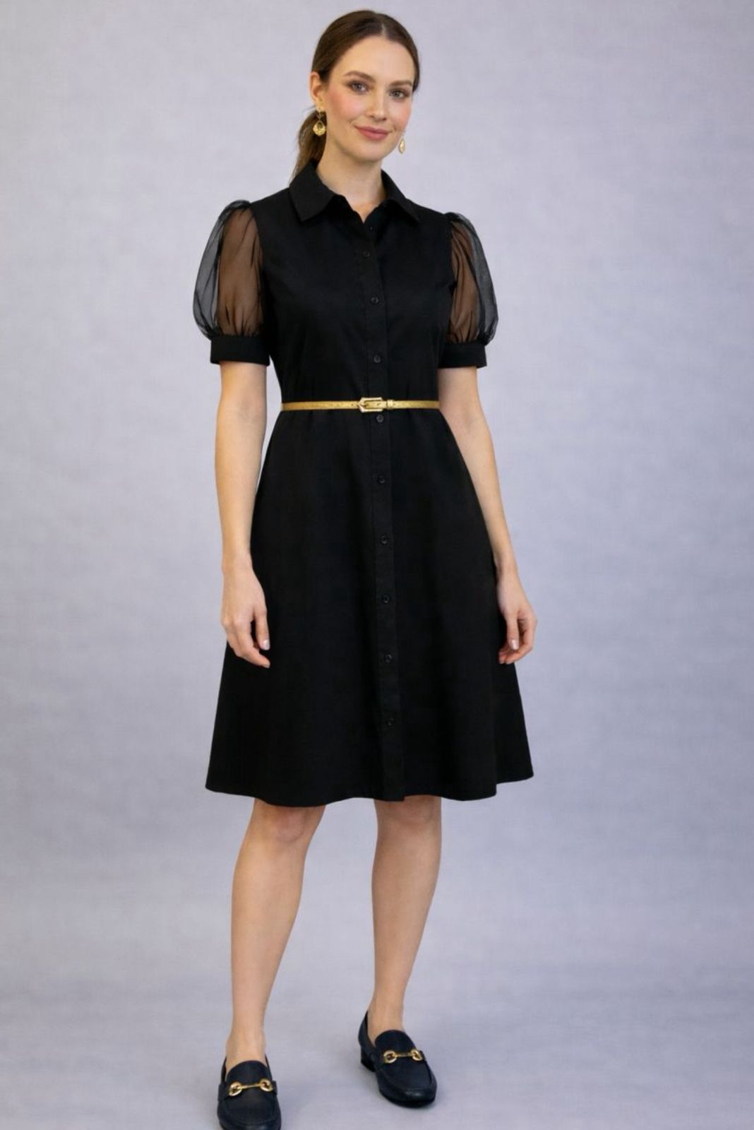 Este vestido negro presenta una manga globo en tul color negro. Una silueta en Línea A, cómoda y muy versátil.