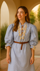 Bolero y los flecos que me hacen fluir sin miedo. Un vestido con una silueta ligera y sin apuros, las mangas imponentes y a su vez descomplicadas.