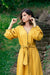 Vestido Mostaza con Elegancia y Silueta Semi Ajustada: Un vestido mostaza con sesgo negro, manga con caída y volumen, cinturón para anudar y escote en V. Su silueta semi ajustada lo hace perfecto para una ocasión especial donde desees destacar con estilo y clase.