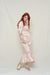 Este vestido cruzado, confeccionado en una tela seda de tono dorado claro, destaca por su brillo sutil y su caída fluida. Las mangas en ondas, ubicadas estratégicamente en los costados, aportan un diseño original y femenino. El detalle de ruche en el ruedo añade movimiento y un aire romántico que acompaña cada paso con gracia.