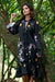 Vestido Amplio con Detalles Decorativos y Estampado Sedoso: Este amplio vestido con cuello y tiras decorativas, manga raglán con tiras de amarre y bolero en el bajo, tiene un encantador estampado en lunares dorado sobre una base de color negro sedoso.